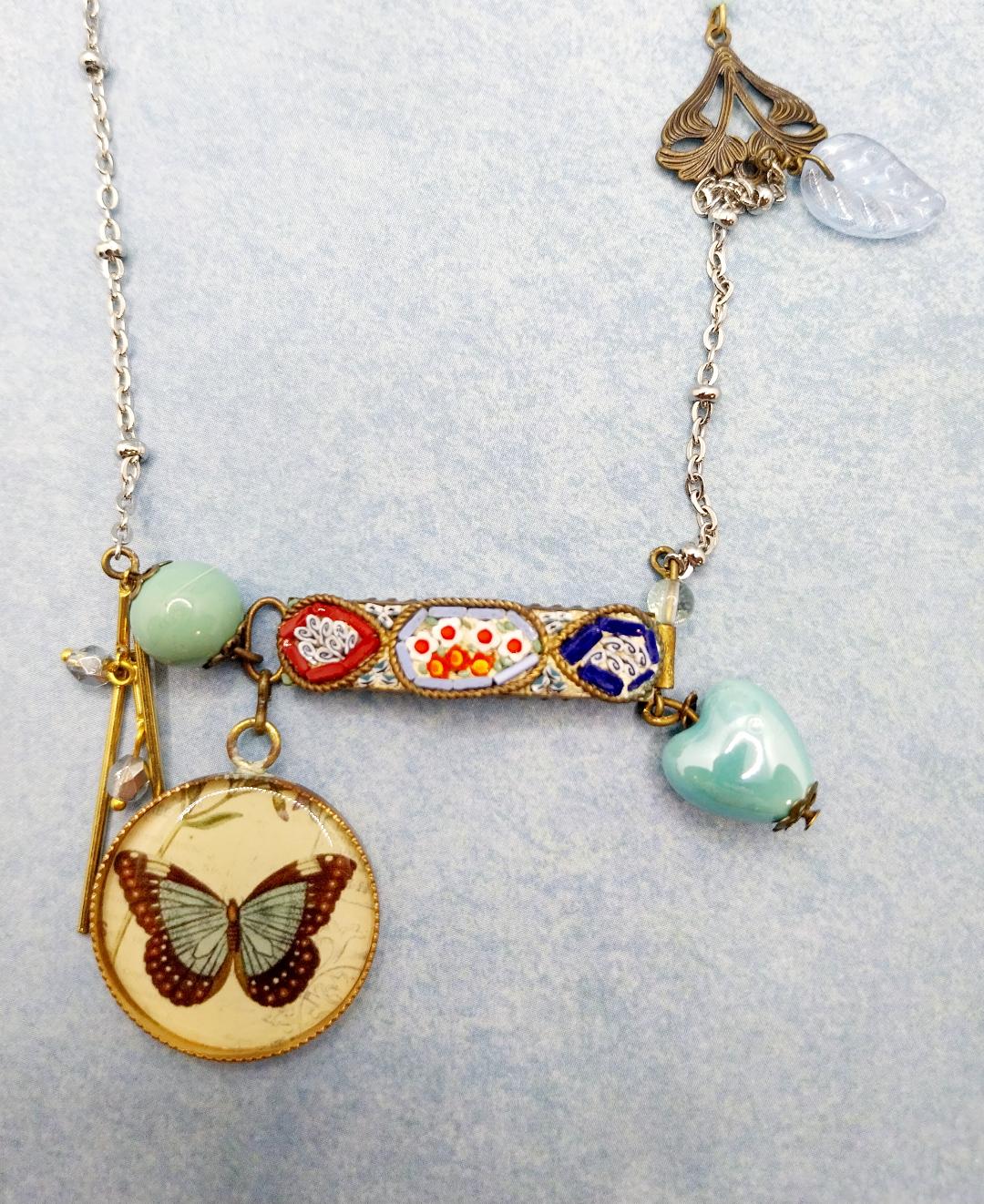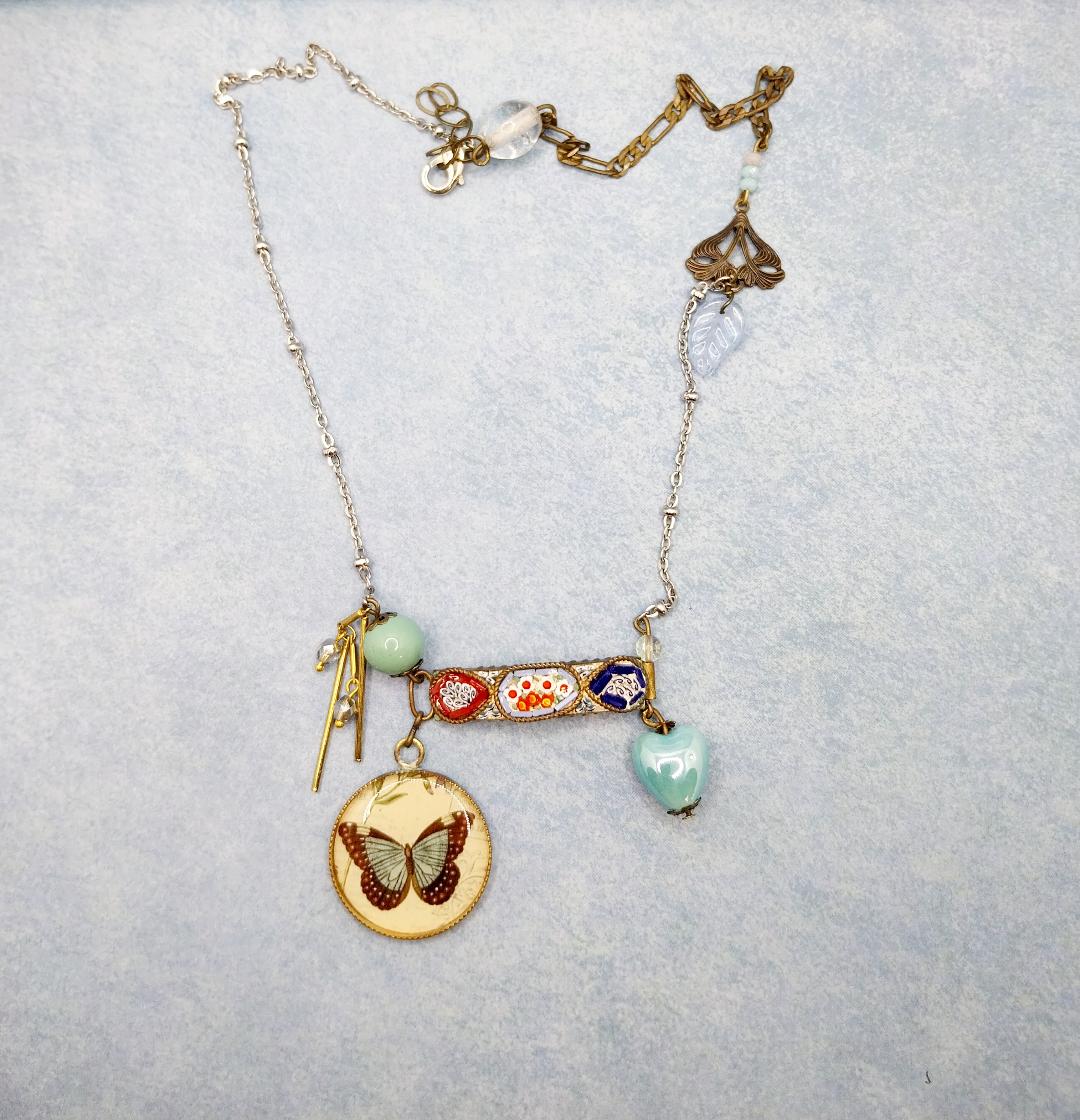 collana corta composta da una catenina argento e color bronzo anticati, da un mosaico vintage italiano, ciondolo con stampa vintage e perline e ciondoli vintage