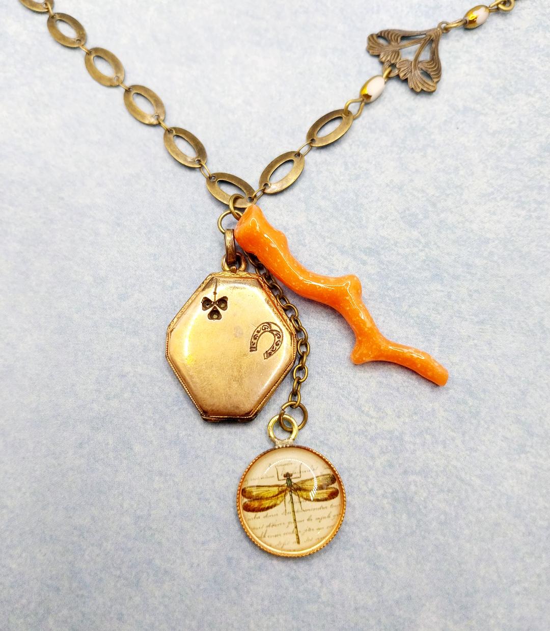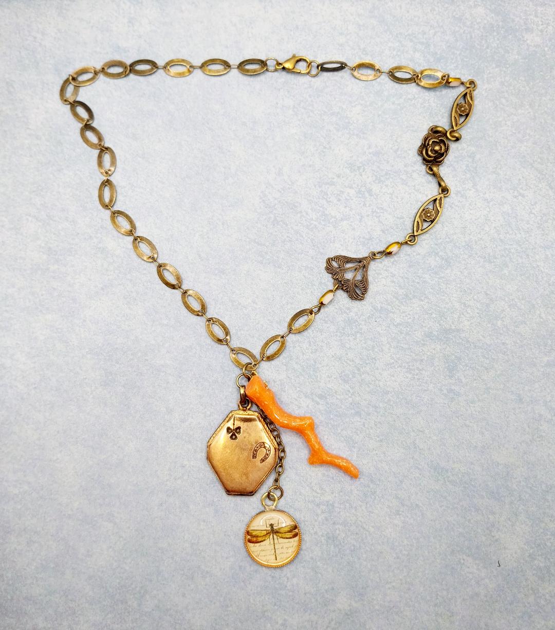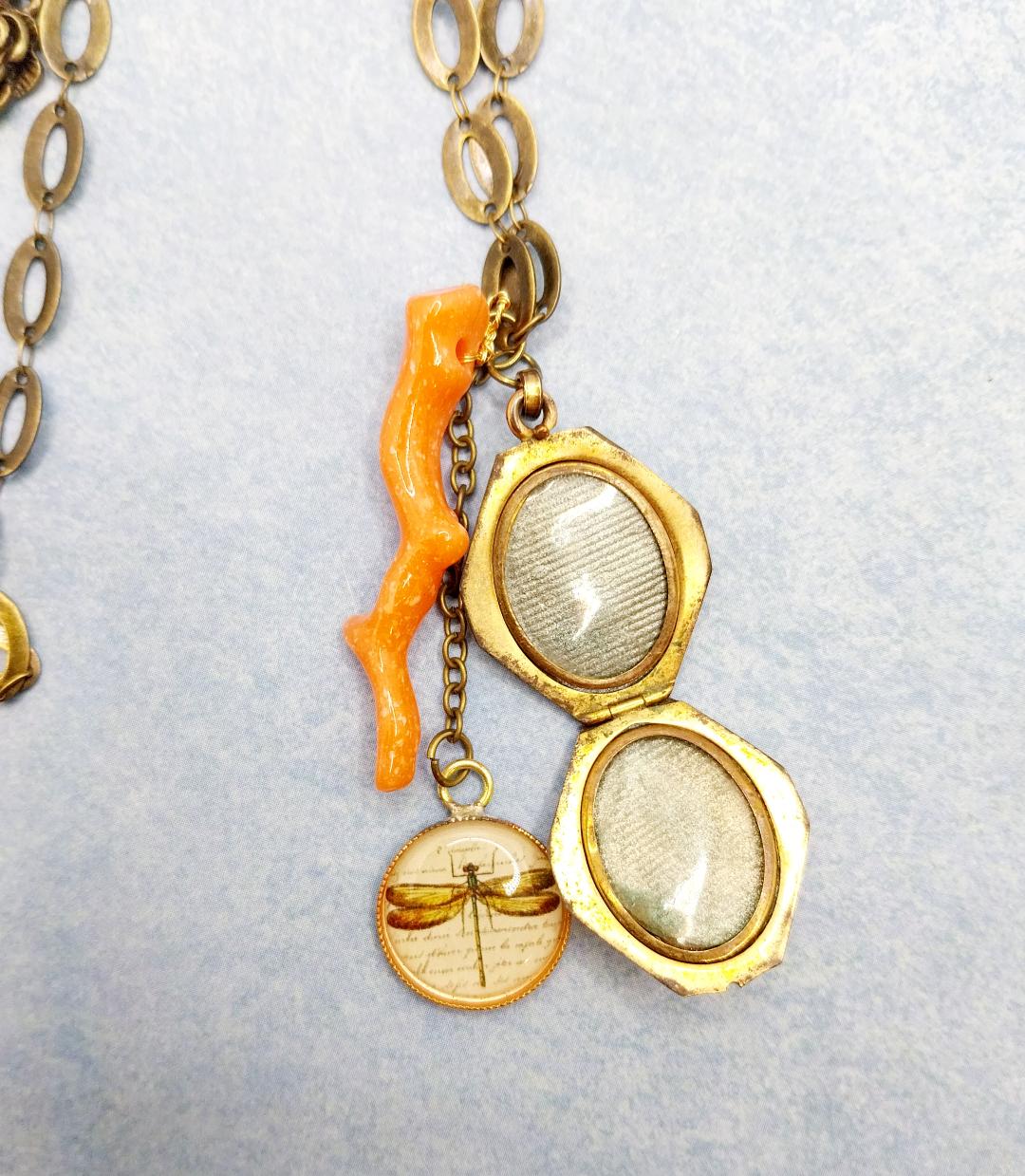 collana corta composta da una catenina lavorata color bronzo anticato, antico locket porta foto doppio, piccolo ciondolo con stampa di libellula vintage e ciondolo in pasta di corallo rosa