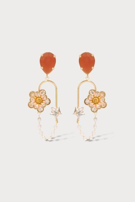 orecchini in acciaio dorato con cabochon in resina, fiore smaltato e stella in cristallo