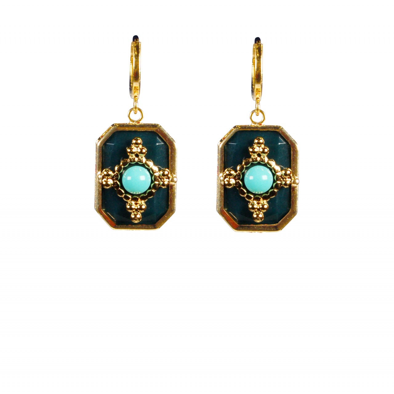 orecchini in ottone dorato con cabochon matte pavone e piccolo cabochon tiffany