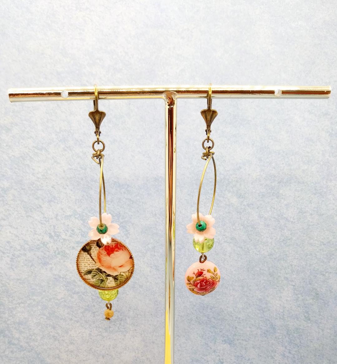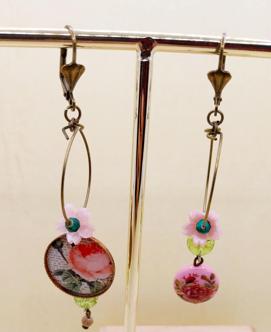orecchini asimmetrici composti da due cerchi sottili con ciondoli e perline vintage