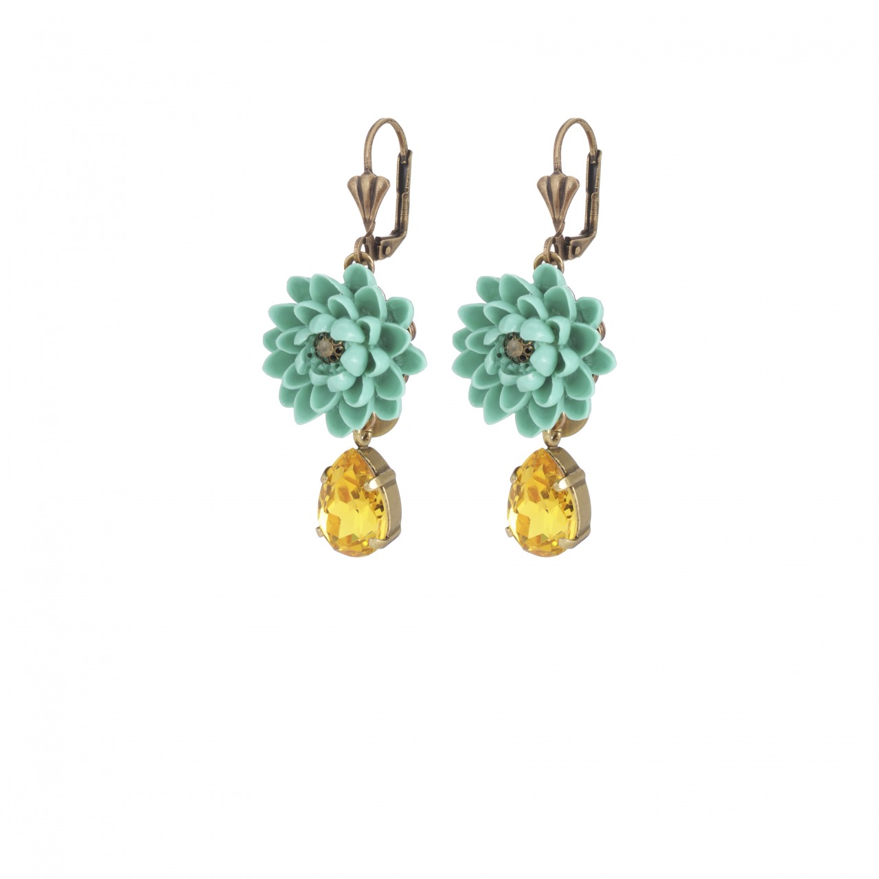 orecchini in ottone anticato con fiore in resina e goccia in cristallo